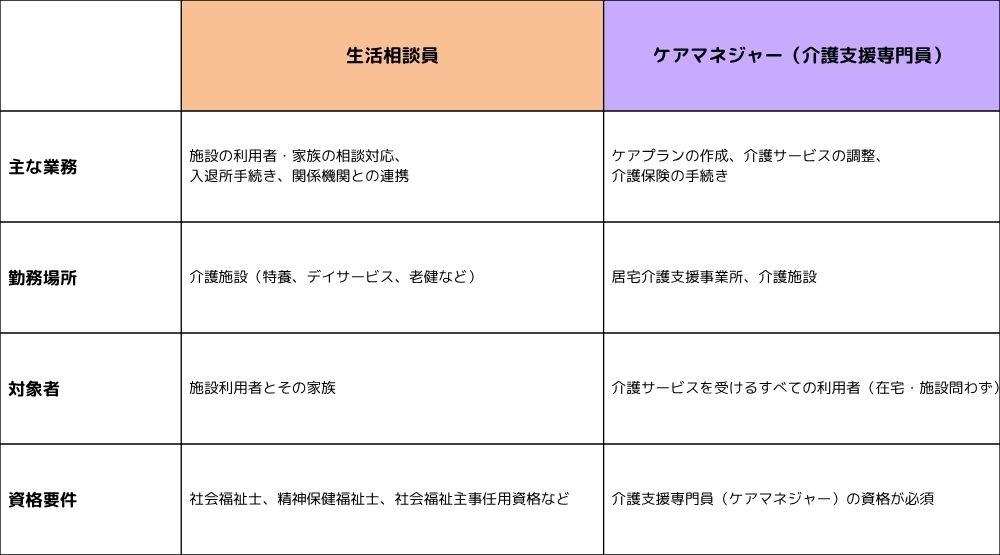 生活相談員とケアマネジャーの主な違い