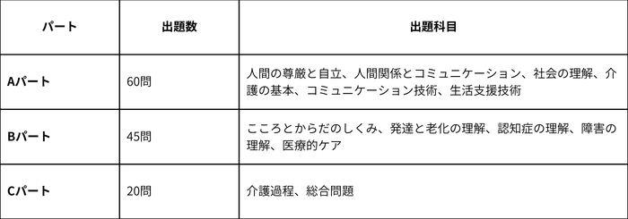 Aパートは「介護の理念や制度、基本技術」、Bパートは「人体の仕組みや疾病などの医学的知識」、Cパートは「実践的な事例対応」が中心です。